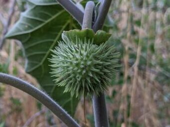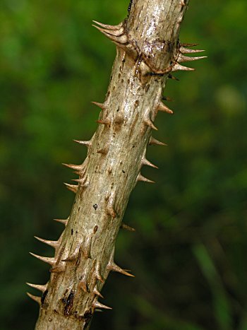 Prickles are outgrowths from the epidermis of the stem or leaves. You will note that prickles are not organized and can occur anywhere on the stem or the leaf, including the blade and/or petiole. The ones along the margins of leaves are somewhat organized. The marginal prickles on leaves are often called spines and the leaves are said to be spinescent, common in several holly (Ilex) species. Prickles on the stem are found in smilax, toothache tree (Zanthoxylum clava-herculis), devil’s walking stick (Aralia spinosa), rose (Rosa spp.), blackberry and dewberry and other brambles (Rubus spp.). Some herbaceous plants produced prickles on the stem or leaves including horse nettle (Solanum caroliense) and thistle (Cirsium spp.). Some plants produce prickles on the fruit as in chinquapin (Castanea pumila) and jimson weed (Datura stramonium).