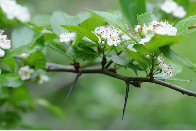 A thorn is a modified stem, so it is located at a node where the branch should be. It would be just above a leaf or leaf scar where the lateral bud is located. Lateral buds usually develop into lateral stems or branches but in some plants they develop into thorns. Also, a thorn can be branched like a stem, whereas a spine or prickle is not branched. The best example of a thorn is honeylocust (Gleditsia triacanthos) but also in hawthorn (Crataegus including mayhaw), crabapple (Malus), and firethorn (Pyracantha). Some spikey plants that seem to have thorns because of the name, like Jerusalem thorn, are actually armed with spines.